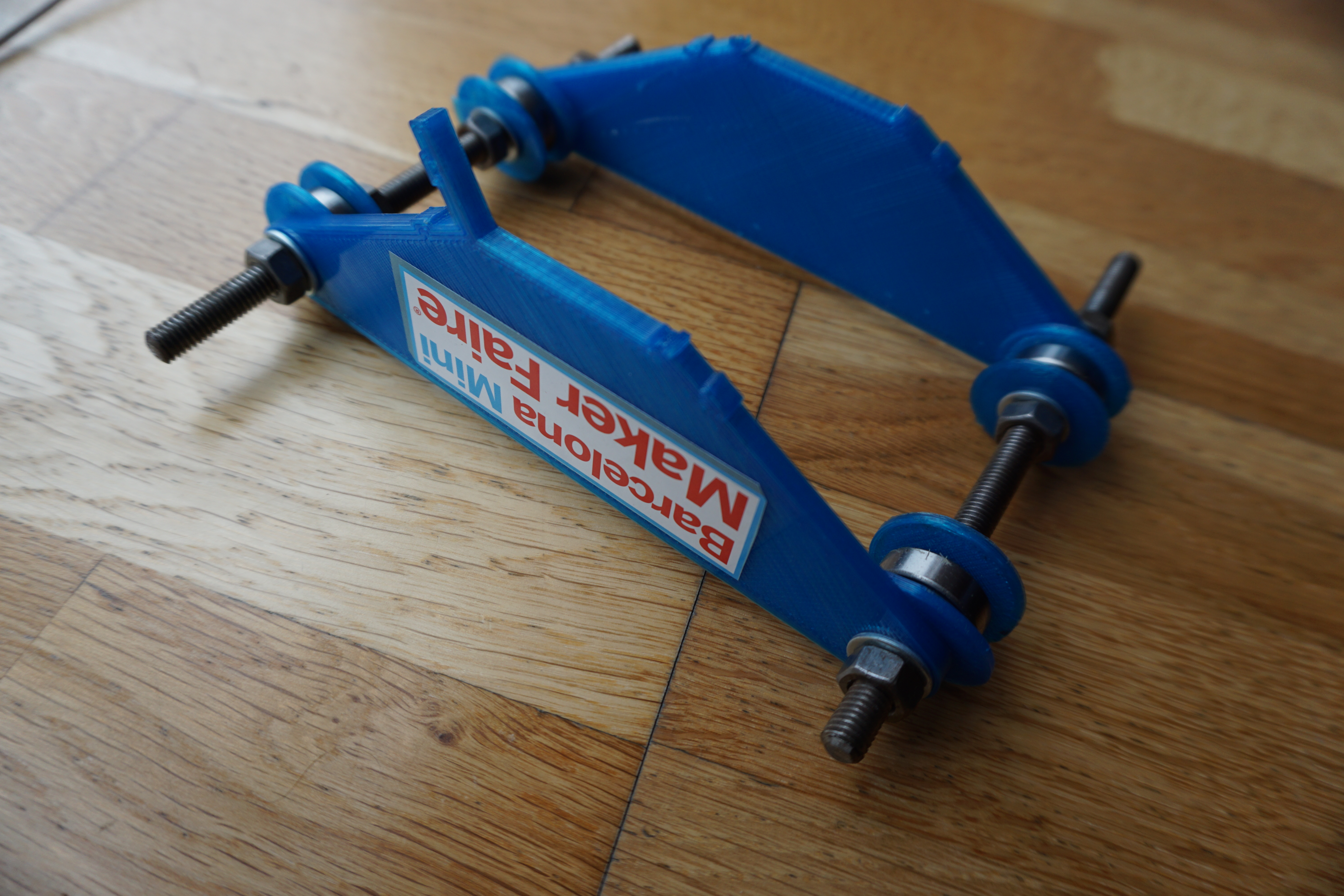 Mientras tanto, hace unas semanas hice un upgrade del soporte para la bobina de filamento. La original se me rompió por varios puntos, debido a una deficiencia en el diseño (sólo queda una de las patitas que se encajaban con los perfiles). Esto se debe claramente a mover la impresora 3D por ahí, a diferentes eventos como las maker faires, printer parties y demás. Por cierto que estamos organizando una Printer Party para el 8 de octubre!!