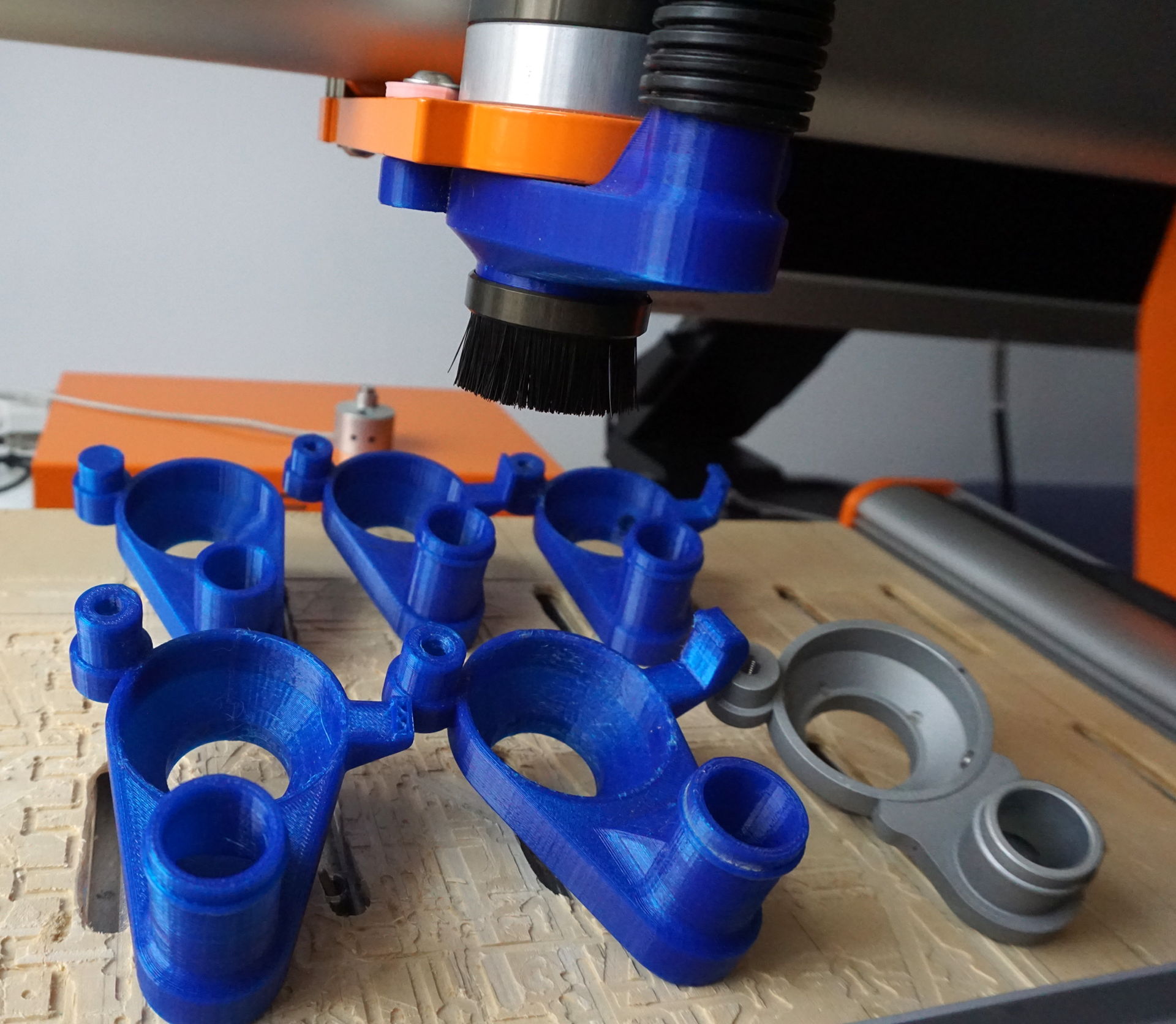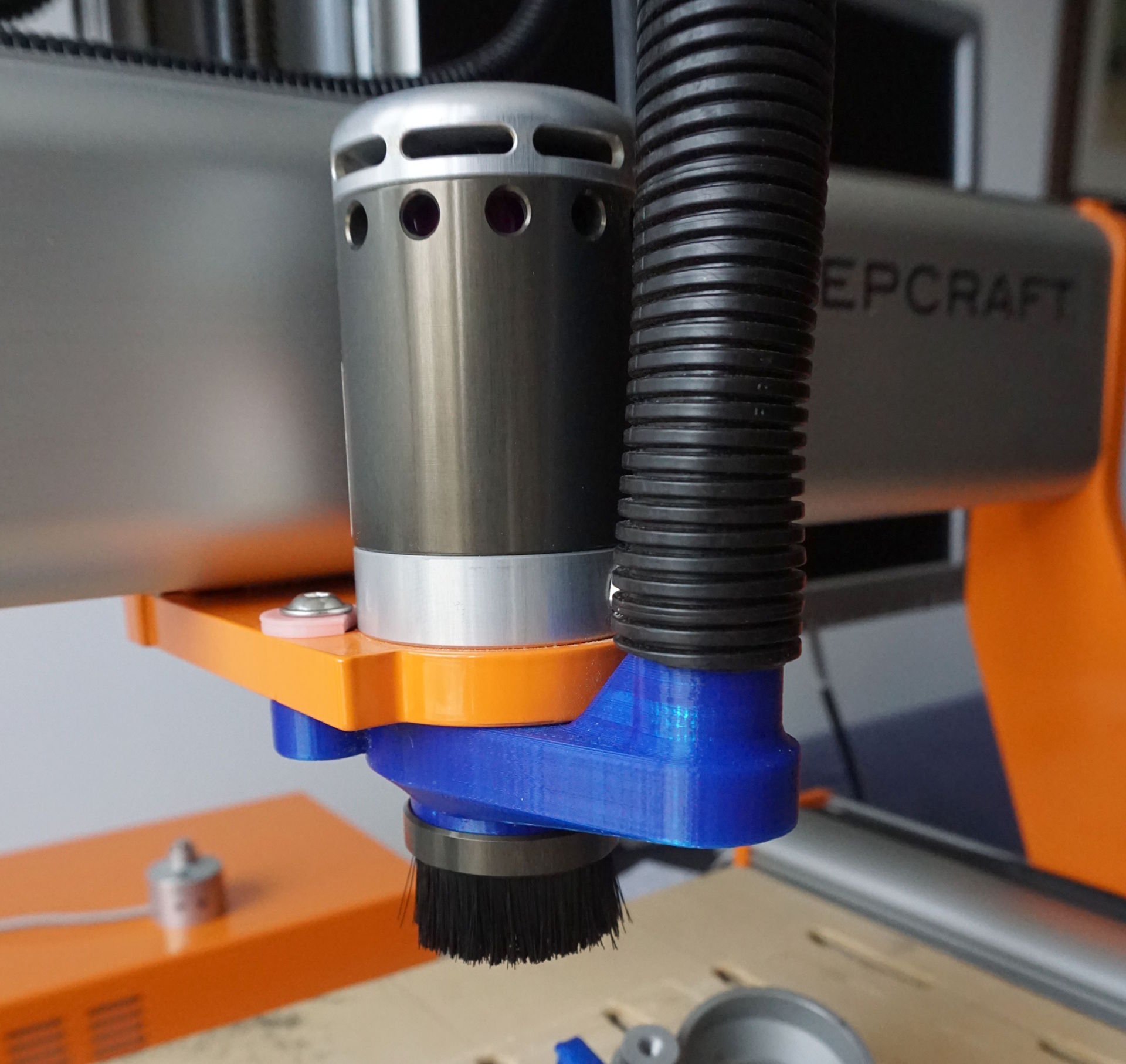 Utilizo con frecuencia una fresadora CNC de Stepcraft, que monté en un kit hace un año aproximadamente. Viene con un accesorio para acoplarle la aspiradora directamente por donde está el soporte del motor, alrededor de la fresa, y así reducir la cantidad de polvo y virutas que se generan.
