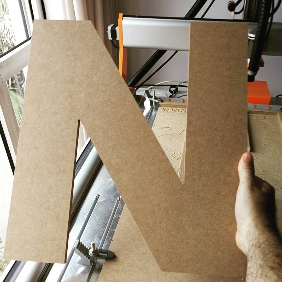 Primeras pruebas han sido con MDF (también conocido como DM), haciendo simple corte en 2D básicamente. Que luego he pintado y barnizado.