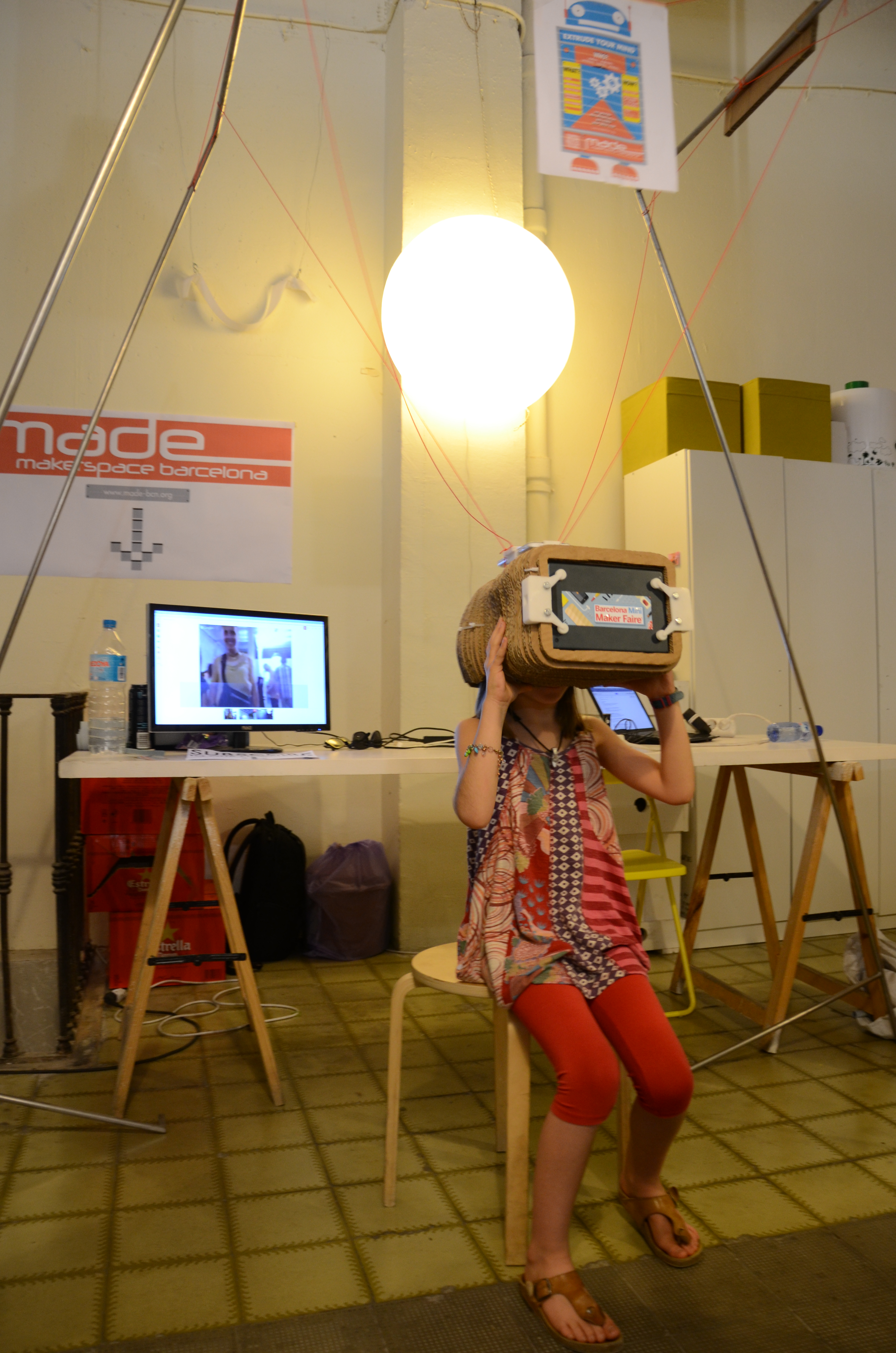 Dentro del “casco” hay un iPad que muestra la imagen de una cámara que está en el sótano y se mueve con un servo accionado por una raspberry pi.