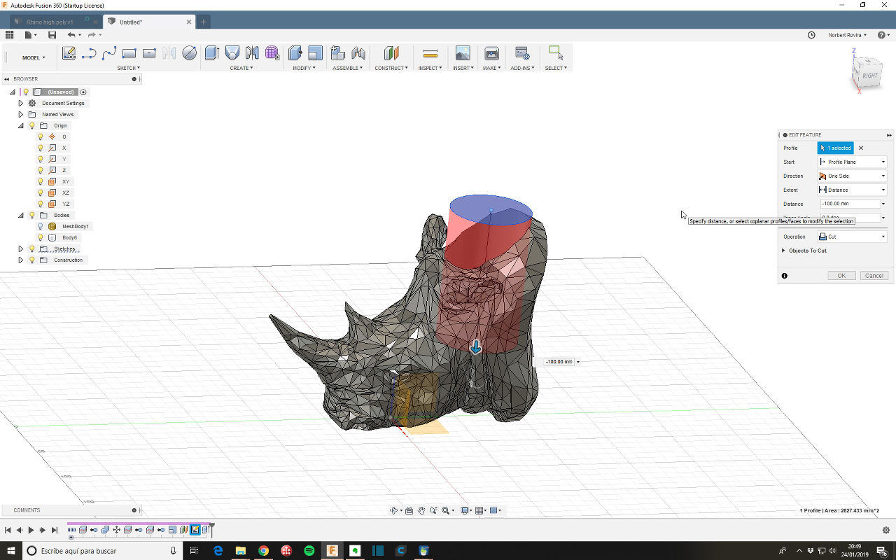 Cargamos el STL en Fusion 360 y lo modificamos para convertirlo en un portalápices añadiendo un agujero y cortándolo por la parte inferior para aplanarlo.