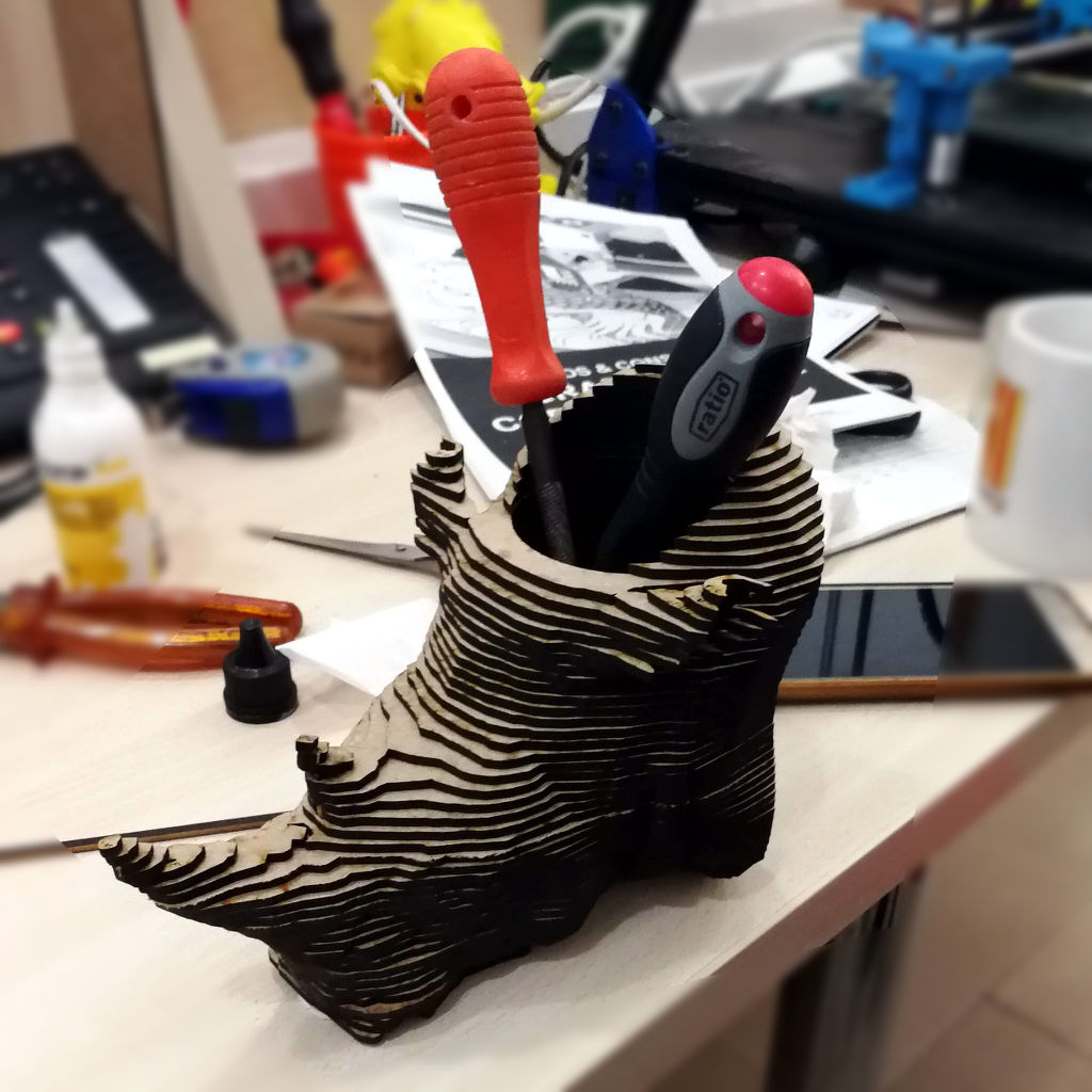 En resumen, se trata de hacer algún objeto que nos interese tener a partir de un diseño 3D que nos descargamos de un repositorio. Lo modificamos a nuestro gusto para convertirlo en un portalápices, cuchillero o lo que quieras. Y después usando Slicer for Fusion 360 lo convertiremos en un ensamble de piezas planas que podemos cortar con la cortadora láser.