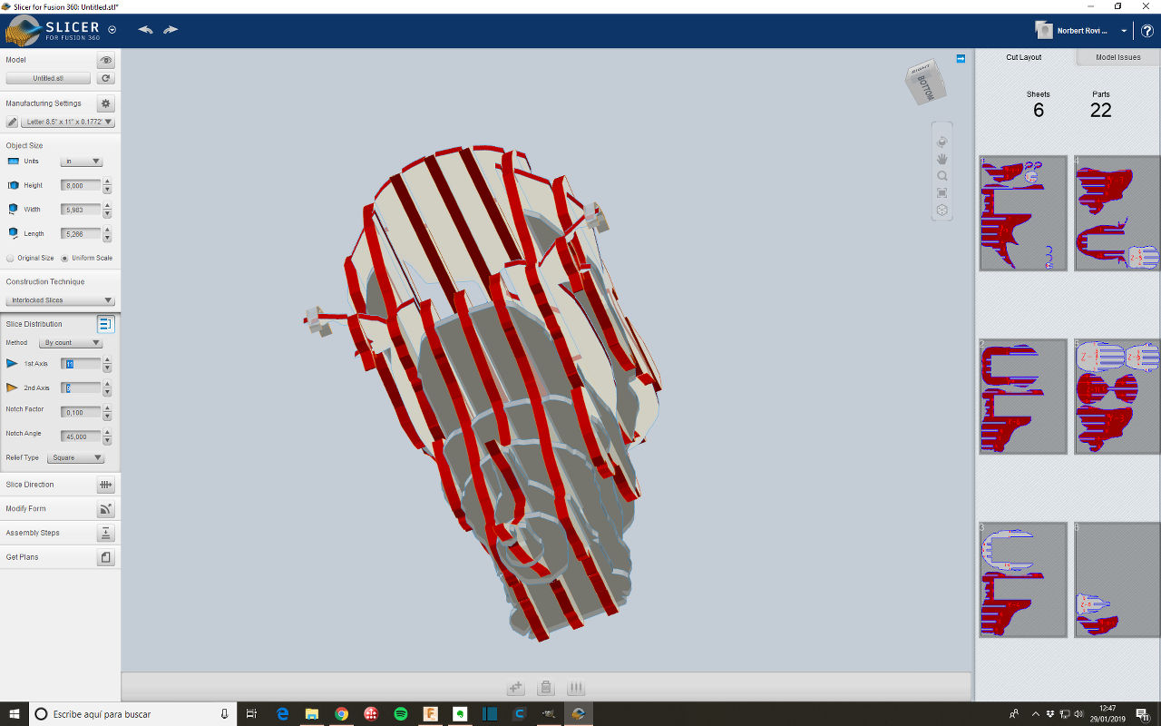 En este ejemplo usamos Stacked Slices, planchas de DM de 3mm apiladas. A la derecha ya se ve el diagrama del corte y el número de tableros de DM que necesitaremos.