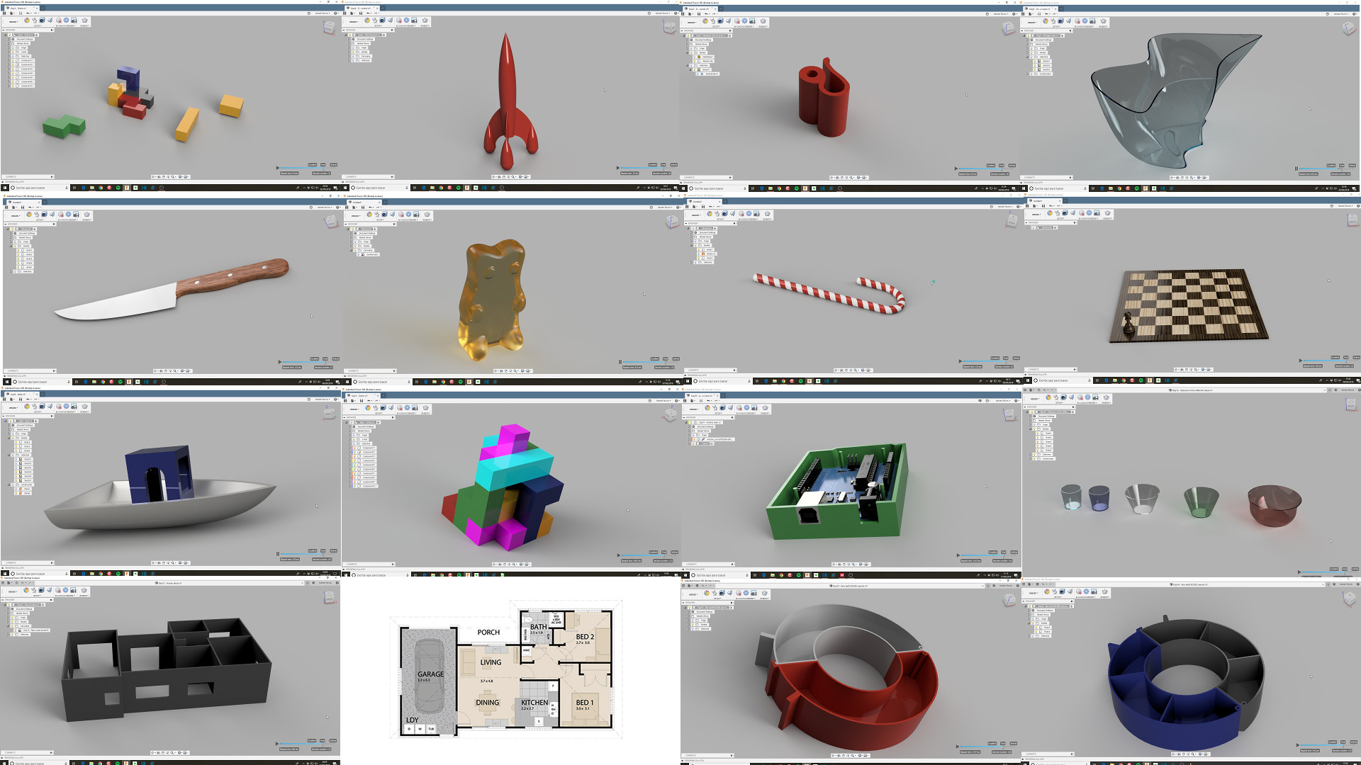 - Tetris en 3D. Diseño de las piezas, uso de componentes y ensamblado entre ellos. En la segunda parte se crean los materiales que faltan, se copian y pegan más piezas como componentes y se siguen ensamblando.