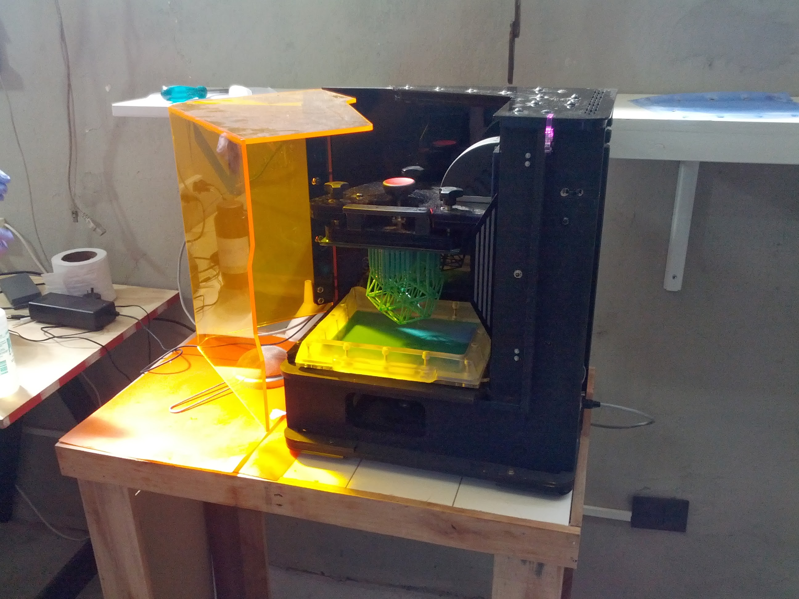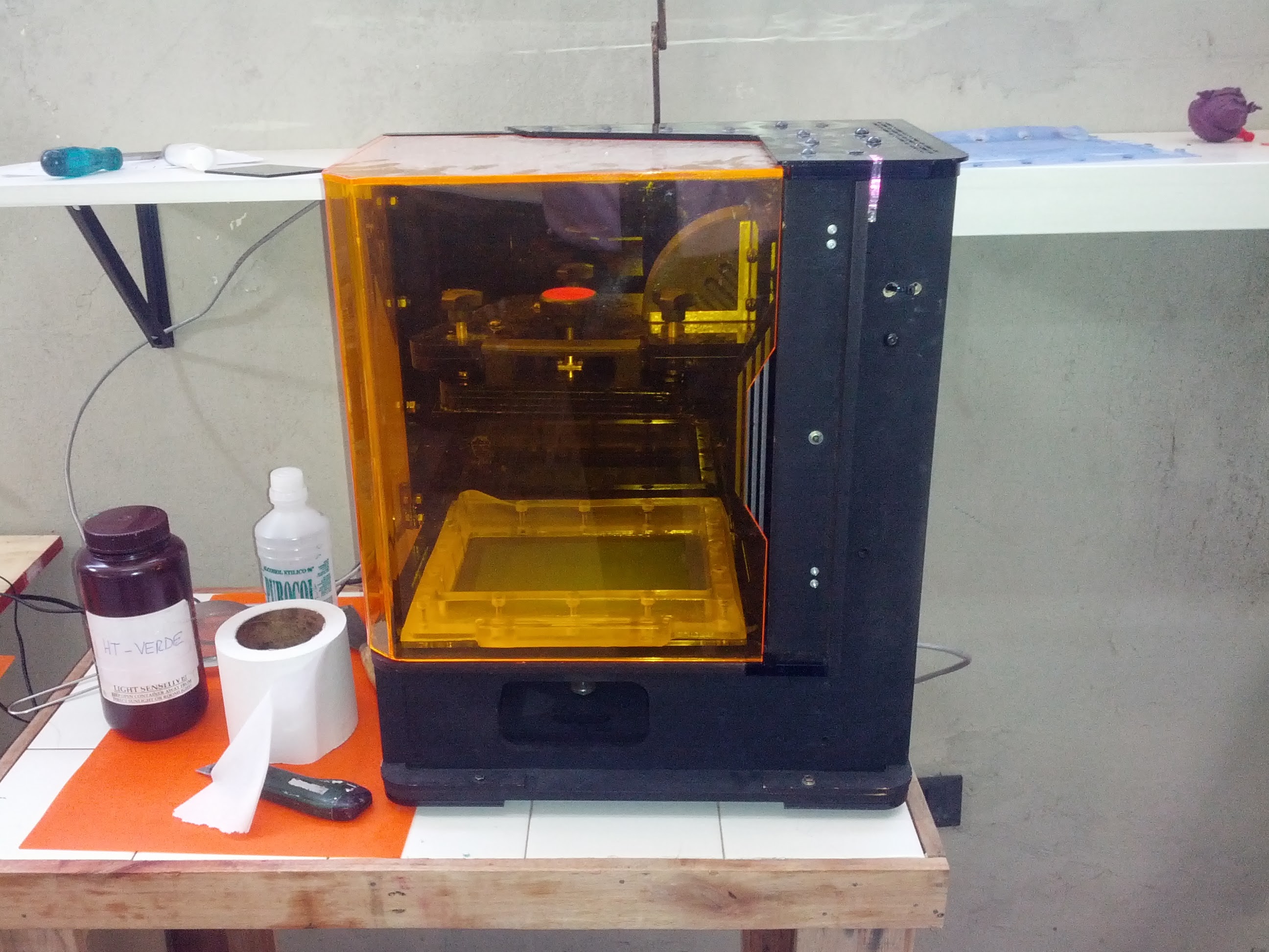 Llegué justo cuando estaban sacando una pieza y pude ver la poca cantidad de resina que tienen en la cubeta al hacerse la impresión con la pieza colgando, y hacia arriba.